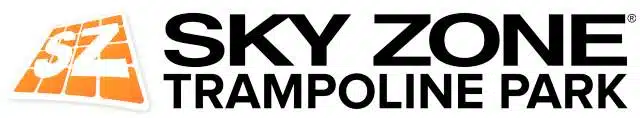 A white rectangular box with the orange and white Sky Zone logo and the words “SKY ZONE TRAMPOLINE PARK” in black letters